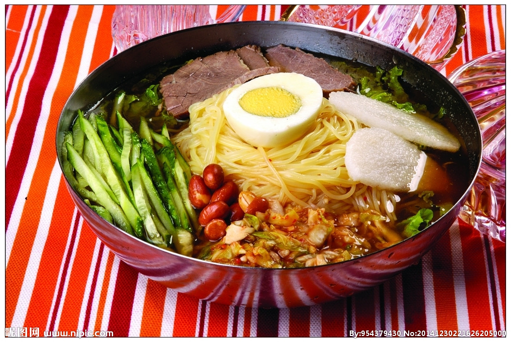 冷面屬于機(jī)壓面條,冷面是小麥粉添加淀粉、食用鹽、食品添加劑(碳酸鈉、梔子黃)、加水經(jīng)過(guò)和面、機(jī)器軋制、晾置、真空包裝而成的濕面制品。冷面經(jīng)浸泡、煮熟、過(guò)涼后,再去冷水伴牛肉片、辣椒、雞蛋、泡菜、梨或蘋果片、醬醋、香油等佐料,加入燉牛骨湯或淹蘿卜泡菜湯等即成。冷面入口后,柔韌耐嚼,涼爽清淡,湯湯水水,滑順潤(rùn)喉,而其中的辣、咸伴以酸甜能立刻勾出口水,再配嚼冷面菜(韓國(guó)泡菜,辣白菜,牛肉,黃瓜絲,煮雞蛋,香菜),令人食欲大增。冷面經(jīng)濟(jì)實(shí)惠,普通百姓都能接受。